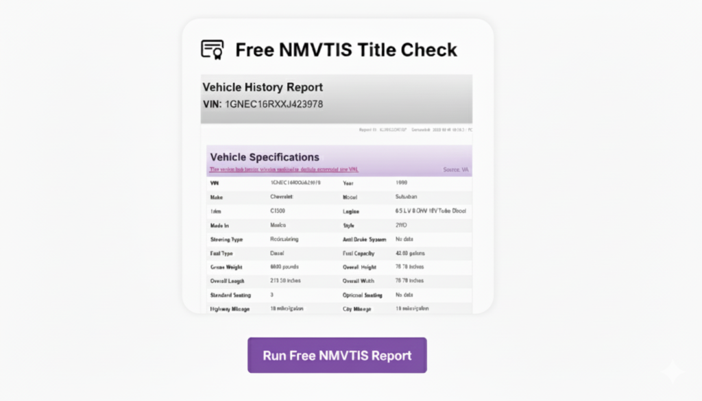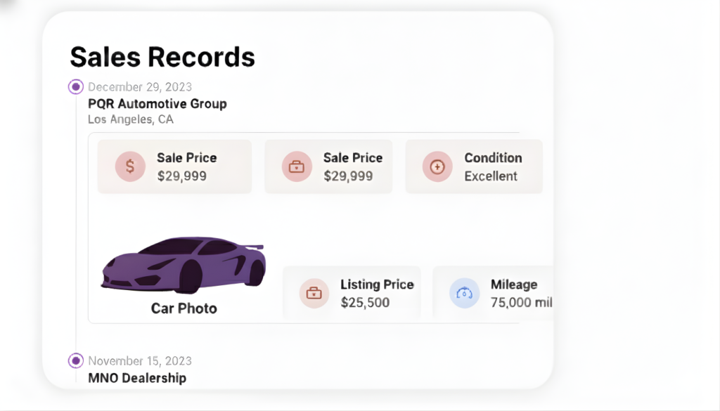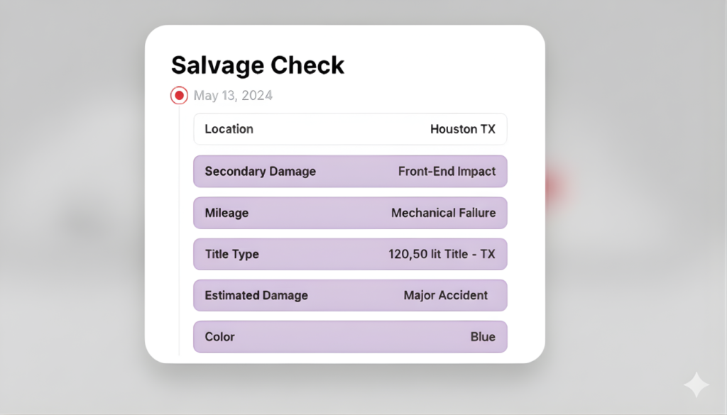 Includes available photos from listings, auctions, or inspections to visually assess the vehicle’s condition.
