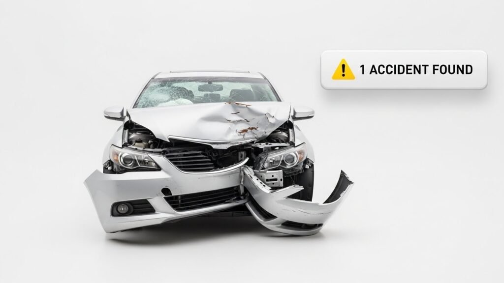 Provides details of reported accidents, impact severity, damage areas, and related repair records that may affect vehicle safety and condition.