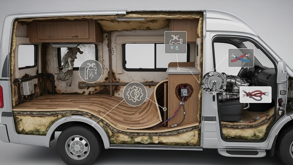 RVs stack chassis problems atop living-space rot. One deluge ruins slide-outs, roofs, and $15k cabinetry.